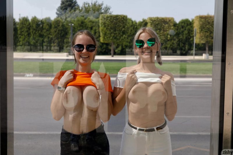 Девушки показывают сиськи на улице